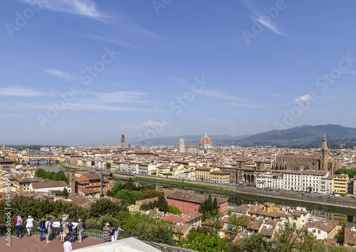 Fototapeta premium A group of tourists admires the wonderful panorama of the historic center of Florence, Italy, from the terrace of Piazzale Michelangelo