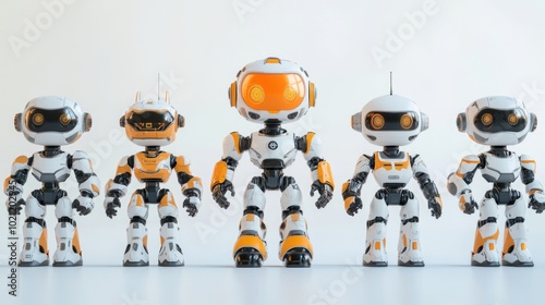 © Fotograf, Fototapeta premium A group of toy robots stand together, colorful and playful