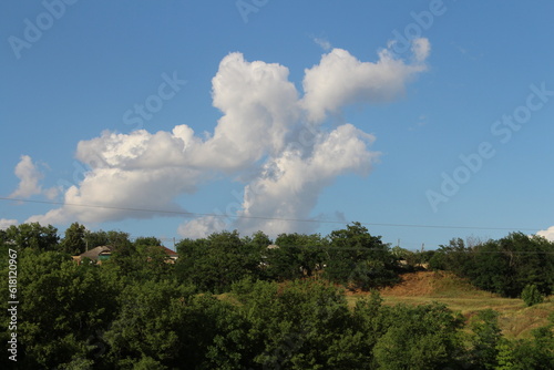 © parpalac, Obraz premium A group of trees and a blue sky with clouds
