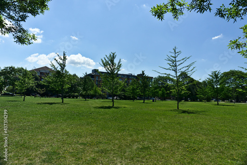 © Rania, Naklejka premium A group of trees in a park with a background of houses and cloudy blue sky on a summer day in Jarry Park, Montreal, QC. Hope, happiness, tranquil, care, thankfulness, inspiration, love concepts