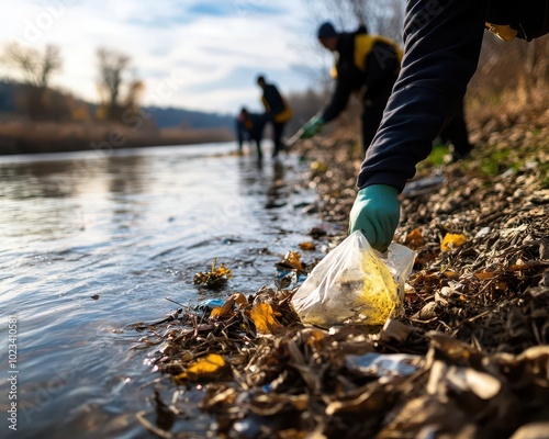 Obraz premium A group of volunteers is picking up plastic waste from a river. This image is...