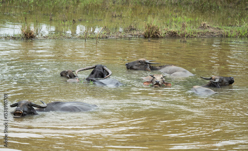 Fototapeta premium A group of water buffaloes cool themselves in a pond on a hot summer day