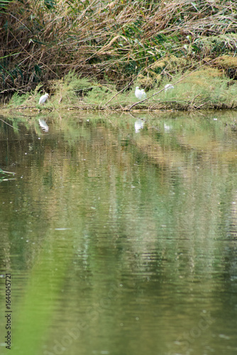 Fototapeta premium A group of white birds, possibly little egrets, are seen on the vegetated bank of a tranquil lake in a natural wetland area. The image captures a serene moment of wildlife.