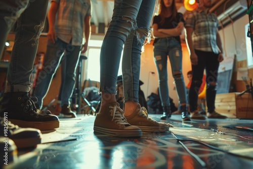 © vefimov, Fototapeta premium A group of young adults in a workshop, brainstorming and collaborating on projects. They are standing close together, indicating teamwork and discussion.