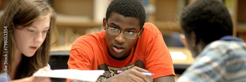 Fototapeta premium A group of young adults sitting closely together around a table, engaged in...