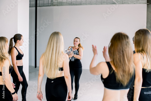Naklejka premium A group of young girls in the fitness room are waiting for them to bring water