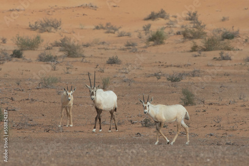 Fototapeta premium A group of young juvenile arabian oryxes in desert landscape. Dubai, UAE.