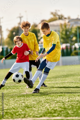 Obraz premium A group of young men energetically kicking around a soccer ball, displaying...