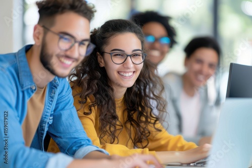 Fototapeta premium A group of young people collaborate and smile while using laptops, showcasing...