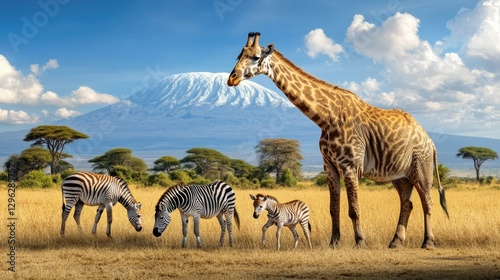Fototapeta premium A group of zebras and giraffes are grazing in a field