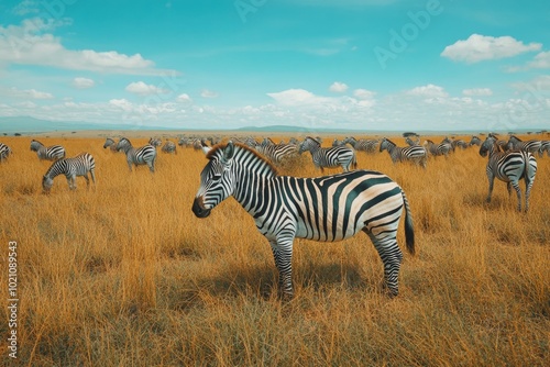 © Fotograf, Naklejka premium A group of zebras standing in a dry grass field, with a sunny sky background
