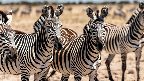 © Idea Library, Fototapeta premium A group of zebras standing together in a verdant field showcasing their unique striped patterns
