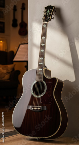 © Dr. Click, Fototapeta premium A guitar leaning against a wall.
