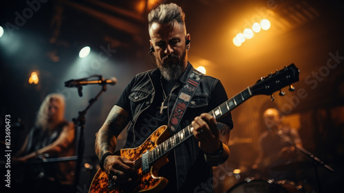 © AS Photo Family, Fototapeta premium A guitarist is intensely performing at a live concert with blurred crowd and lights