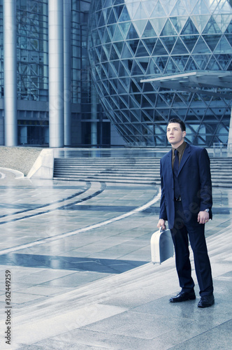 Obraz premium A guy in business suit carrying a briefcase waiting outside the lobby