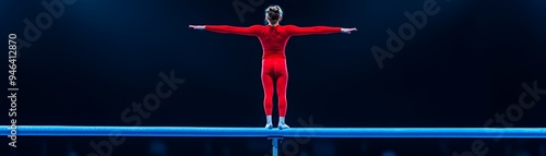 © kinara art design, Fototapeta premium A gymnast in a red outfit performs on a balance beam under dramatic lighting.