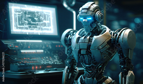 © Nilima, Fototapeta premium A hacker robot attempting to breach a computer system or network