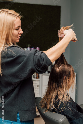 © Ирина Санжаровская, Fototapeta premium A hairdresser cuts a blonde's hair in a beauty salon. Women's haircut