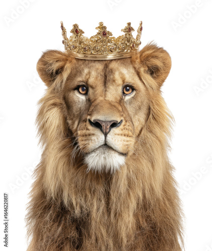 Fototapeta premium A half-body lion wearing a golden royal crown isolated