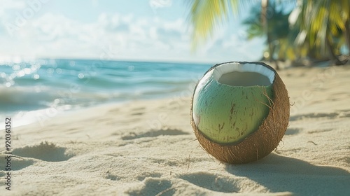 Obraz premium A Half-Opened Coconut Shell Resting on a Sandy Beach