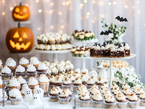 Naklejka premium A Halloween dessert buffet with bat-shaped brownies ghost cupcakes