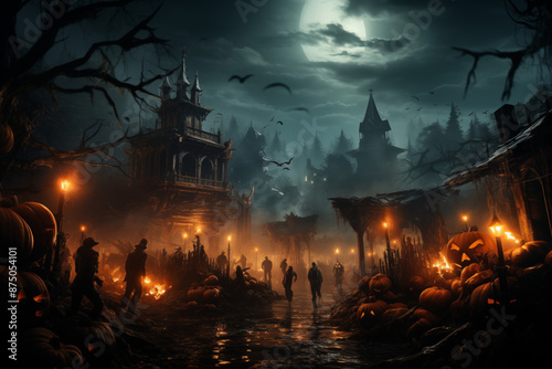 © Store at the corner, Obraz premium A Halloween party overrun by zombies with glowing jack-o'-lanterns scattered around