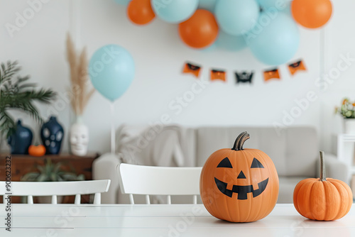 © Kitta Studio, Obraz premium A Halloween party scene with pumpkins, balloons, and festive decorations