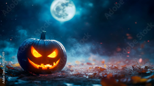 Naklejka premium A Halloween pumpkin glowing fiercely against a foggy moonlit night, with...