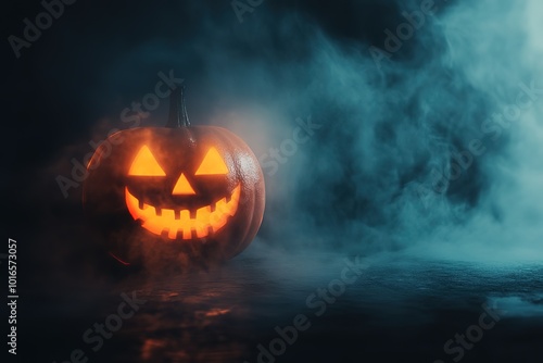 © STF Design , Naklejka premium A Halloween pumpkin glowing in the fog on a dark background with copy space, a Halloween concept banner design. A Halloween pumpkin on a dark blue background with smoke