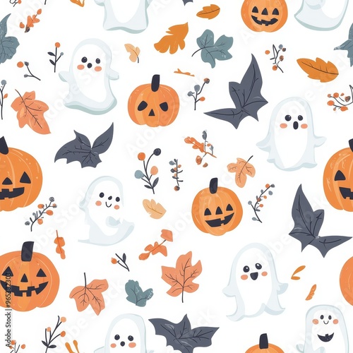 Naklejka premium A Halloween themed pattern of white ghosts and leaves