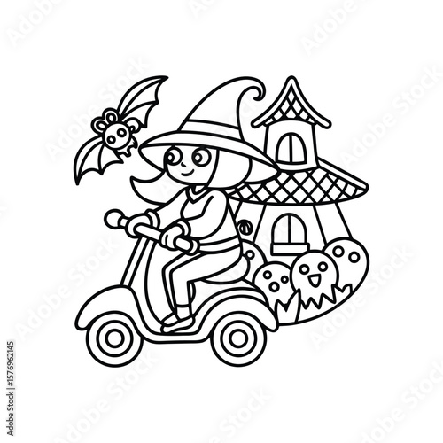 Fototapeta premium A Halloween witch riding a scooter with joy kids coloring book Vector...
