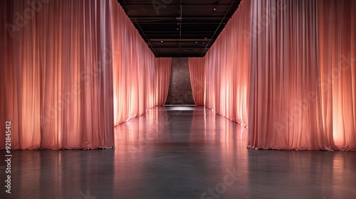 © Sonya, Fototapeta premium A hallway adorned with pink curtains and a clock hanging at its endpoint