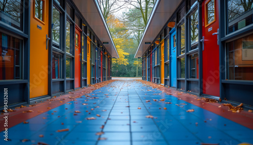 Fototapeta premium A hallway with many doors and windows. The hallway is mostly blue and red