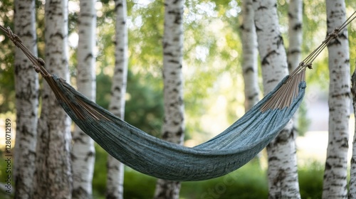 Fototapeta premium A hammock suspended between two tall trees in a dense forest, perfect for...