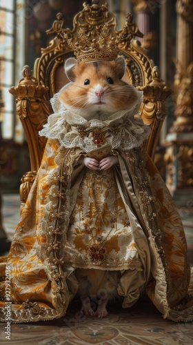 © sergio, Fototapeta premium A hamster dressed as royalty sits on a throne. AI.