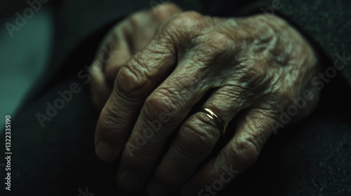 Fototapeta premium A hand, adorned with a simple ring, tells a story of time and life through its weathered texture, softly lit to highlight its journey.