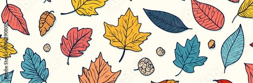 © schmidt, Obraz premium A hand drawn horizontal banner pattern with autumn bright leaves and berries. A flat doodle style illustration.