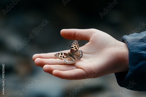 © Sanchai, Obraz premium A hand gently holding a butterfly, capturing the beauty of nature and fragility