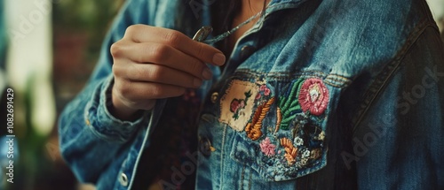 Fototapeta premium A hand gently touches a denim jacket adorned with vibrant patches, capturing...