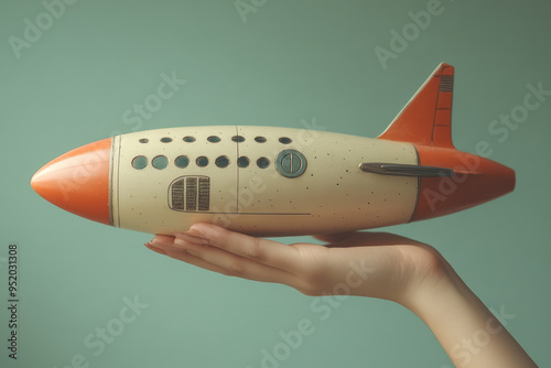 © Natalia, Fototapeta premium A hand holding a small model of a spacecraft, isolated on a pastel green background,