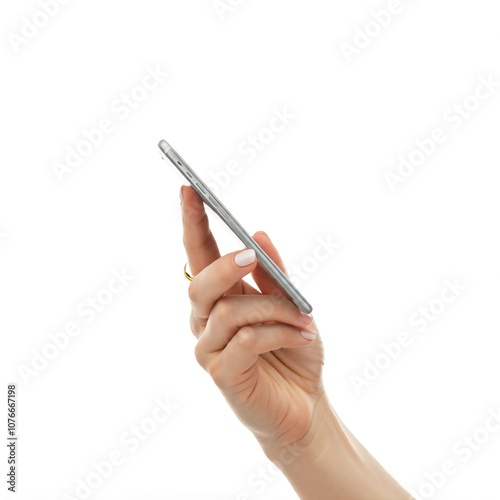 © Armande, Naklejka premium A hand holding a smartphone with the screen tilted towards the light