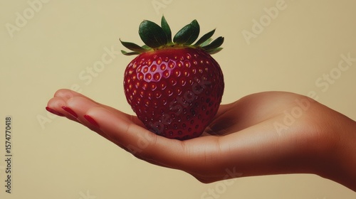 © StasySin, Obraz premium A hand holding a strawberry. Concept of care and attention to detail, as the person is holding the strawberry delicately and with a gentle touch. The image also suggests a sense of freshness