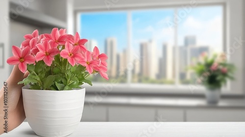 © Edi Purnomo, Fototapeta premium A hand holds a pot of pink flowers in front of a window with a city skyline view.