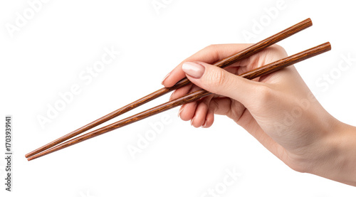 © cabedol, Fototapeta premium A hand holds wooden chopsticks (4)