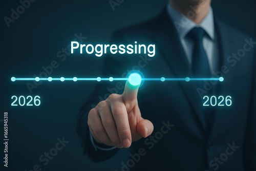 Fototapeta premium A hand interacts with a digital timeline highlighting progress towards 2026,...