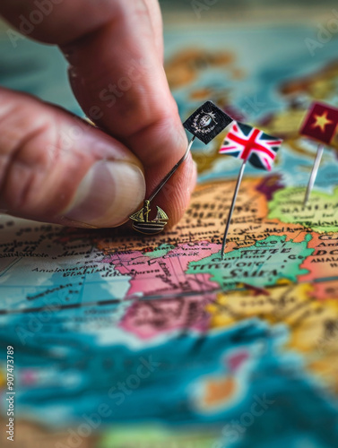 © alfa27, Obraz premium A hand is pointing at a map with flags on it