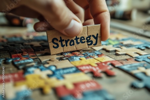 Fototapeta premium A hand placing a puzzle piece labeled "Strategy" into a partially assembled...