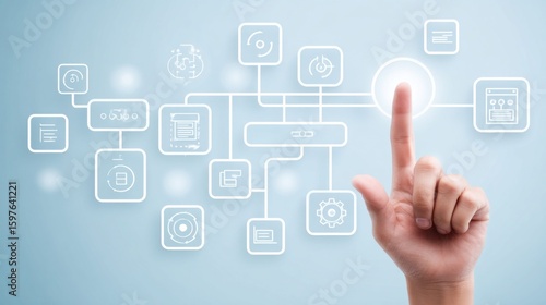 Fototapeta premium A hand points toward a glowing touch screen interface, symbolizing...