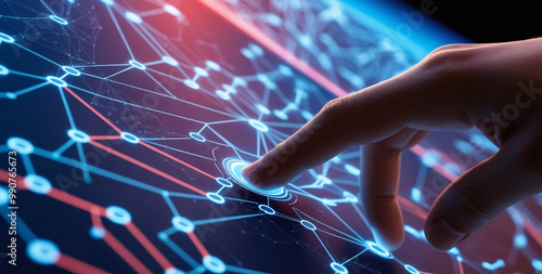 © budi, Naklejka premium A hand reaching out to touch a complex network of interconnected nodes, symbolizing digital connectivity and innovation.