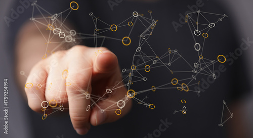 Fototapeta premium A hand reaching out to touch a digital network of interconnected points, symbolizing connection, communication, and data flow in a modern tech e